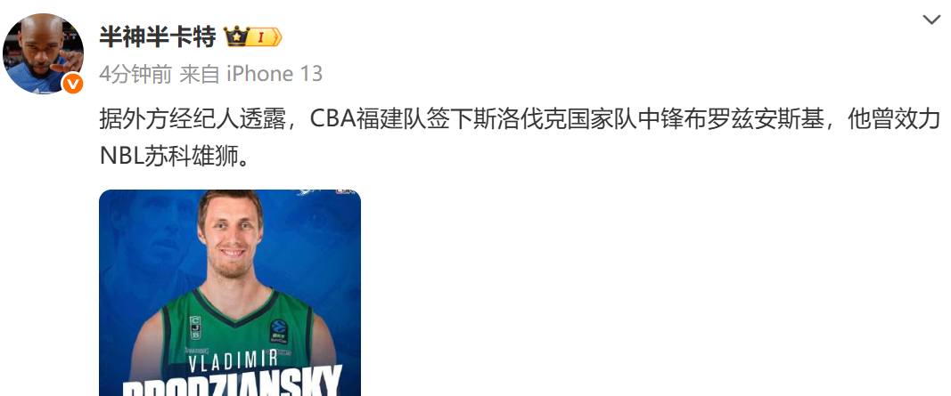 6686体育官网11月5日讯 据国内媒体人“半神半卡特”报道,据外方经纪人透露,CBA福建队签下斯洛伐克国家队五号位布罗兹安斯基,他曾效力NBL苏科雄狮。