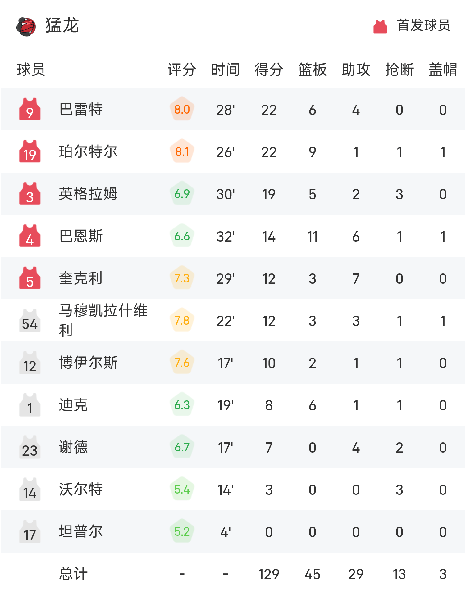 巴雷特得到22分6板4助率队取胜,西亚卡姆空砍全场最高的30分4板3助。