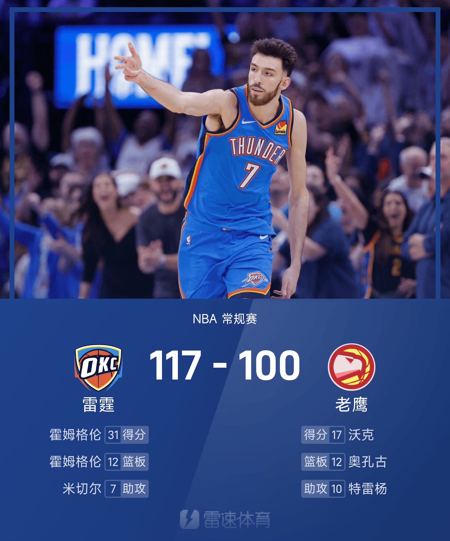 NBA战报:霍姆格伦31分12板,雷霆117-99轻取老鹰