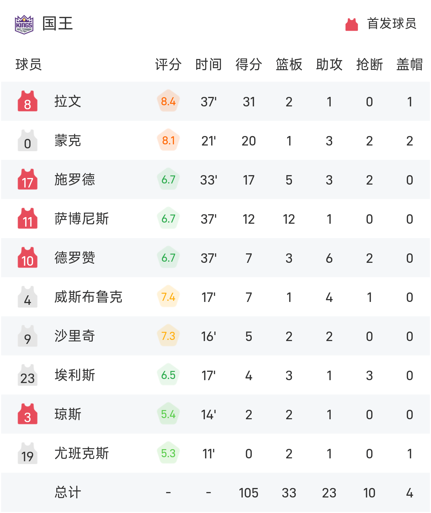 6686体育官网10月25日讯 25/26赛季NBA 常规赛,国王对阵爵士。双方全场战罢,国王105-104战胜爵士。拉文得到31分2板1助率队取胜,马尔卡宁空砍全场最高的33分4板1助。