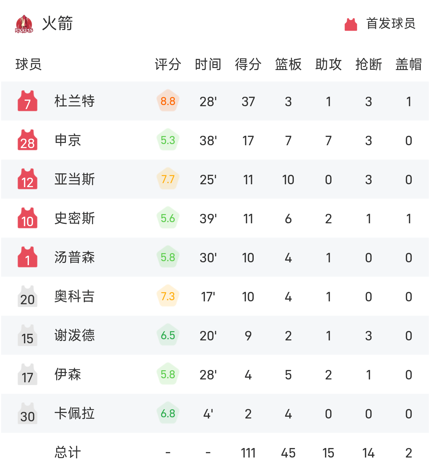 6686体育官网10月25日讯 25/26赛季NBA 常规赛,火箭对阵活塞。双方全场战罢,火箭111-115不敌活塞。康宁汉姆得到21分7板9助率队取胜,杜兰特空砍全场最高的37分3板1助。