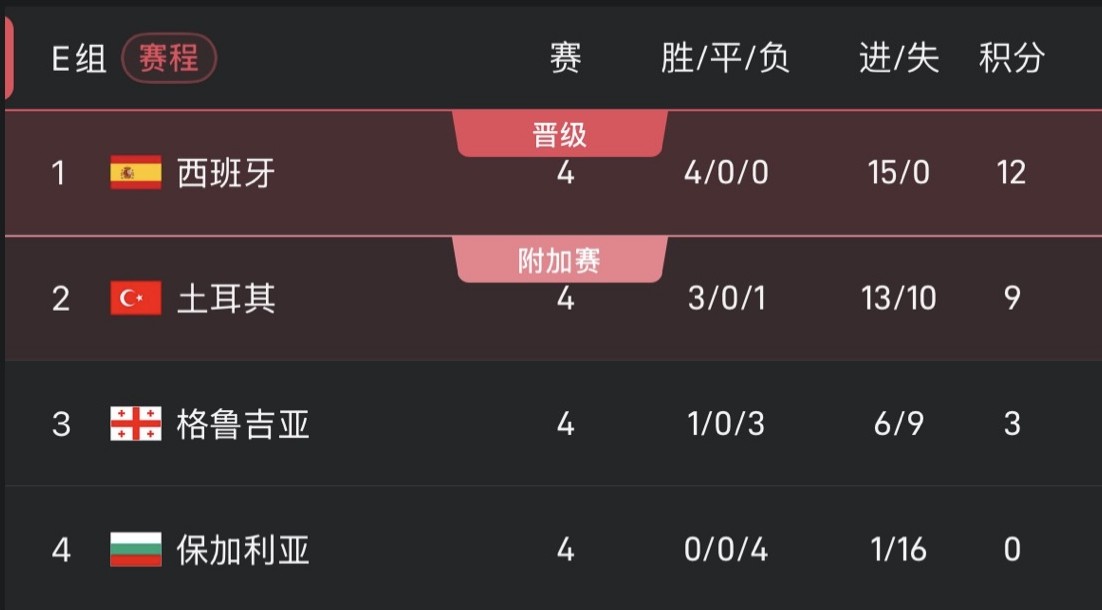 西班牙若战胜格鲁吉亚,且土耳其未能击败保加利亚,便可提前出线。否则,小组头名很可能在最后一轮西班牙与土耳其的直接对话中决定。