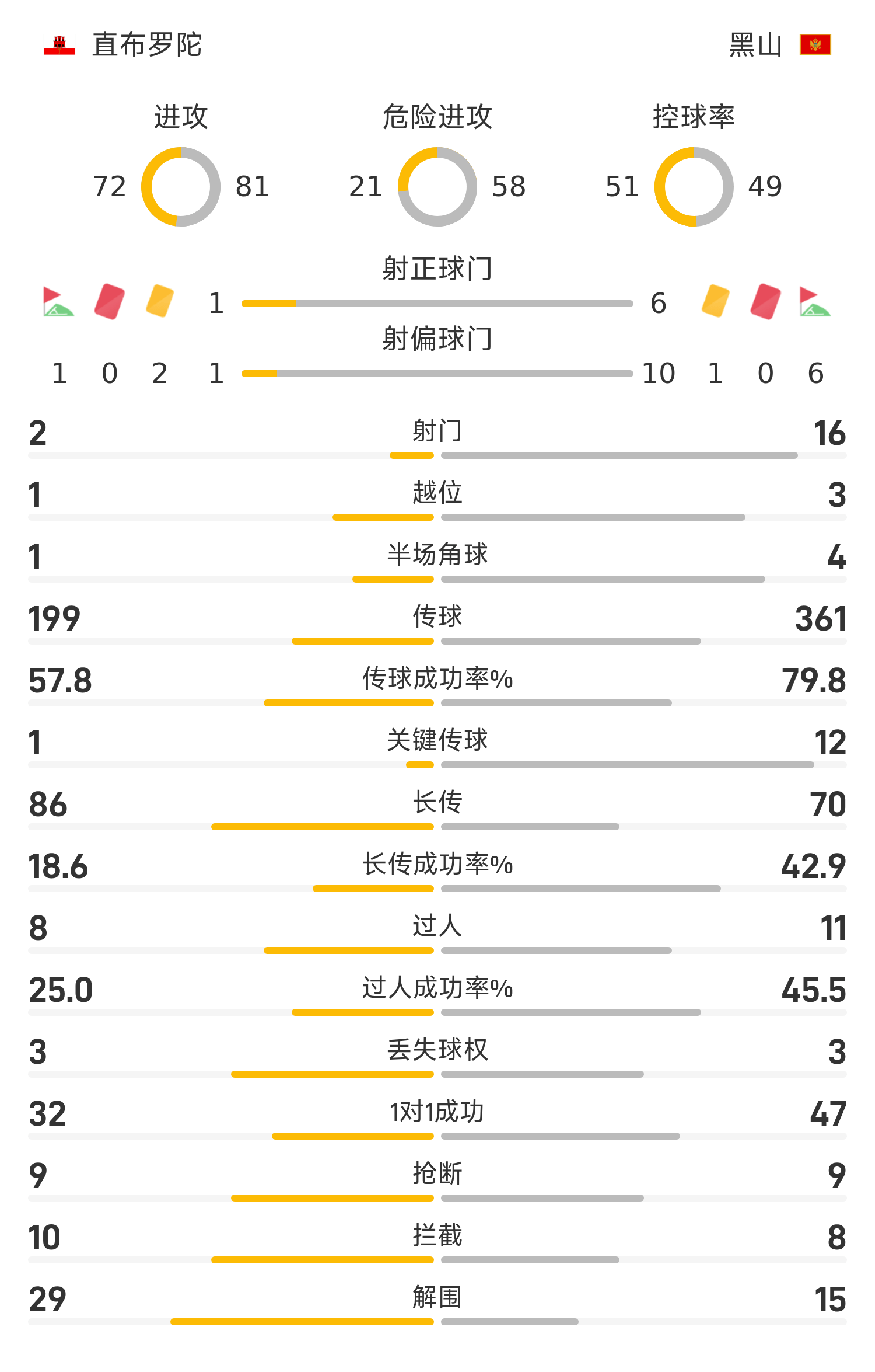 6686体育官网11月15日讯 世欧预分组赛L组第9轮,直布罗陀坐镇主队场迎战黑山。此役上半场,杰索普单刀破门,阿季奇主罚自由球建功扳平局赛果分,科斯托维奇点射命中。易边再战,双方均未破门。全场竞赛终结,黑山2-1直布罗陀。