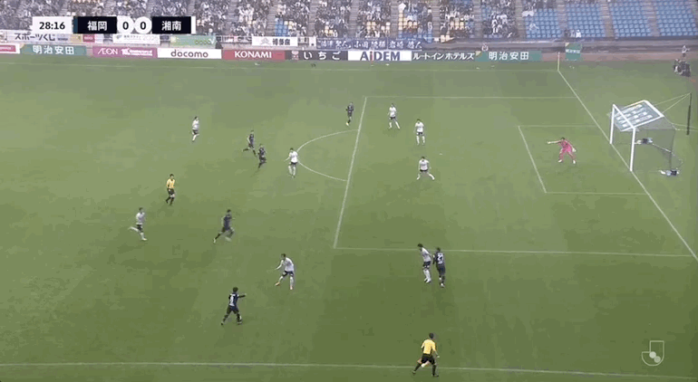 44’名古新太郎三秒区小角度打门,湘南丽海守门员将球扑出端线
