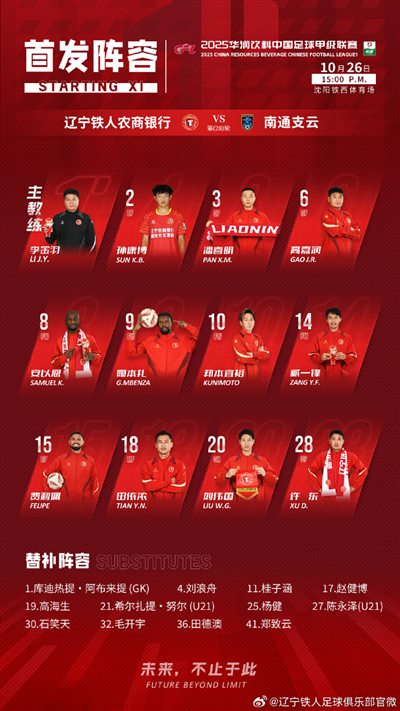6686体育官网10月26日讯 中甲联赛事第28轮,辽宁铁人主队场迎战南通支云,赛前双方首发出炉。