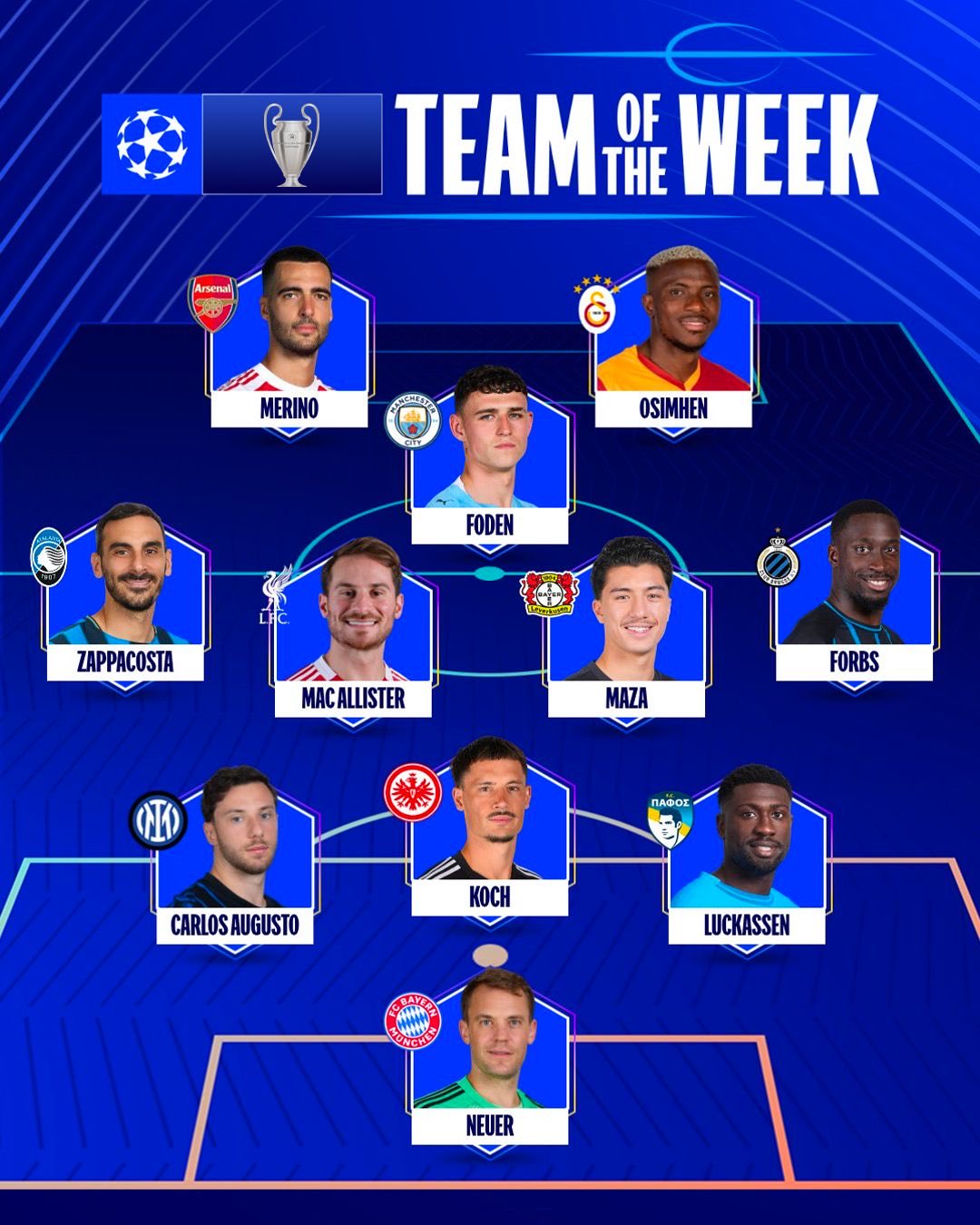 6686体育官网11月7日讯 欧足联官方公布了联赛事阶段第四轮的周最佳阵容,奥斯梅恩、诺伊尔领衔该榜单,福登、麦卡利斯特、梅里诺在列。